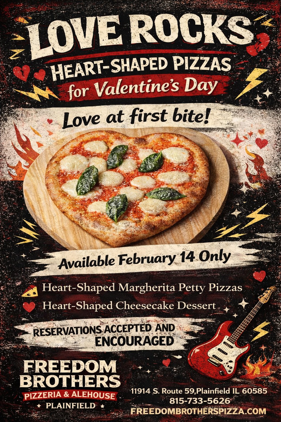 📅 February 14 🍕 Heart-Shaped Margherita Petty Pizzas 🍰 Heart-Shaped Cheesecake Dessert 📞 Reservations accepted & encouraged